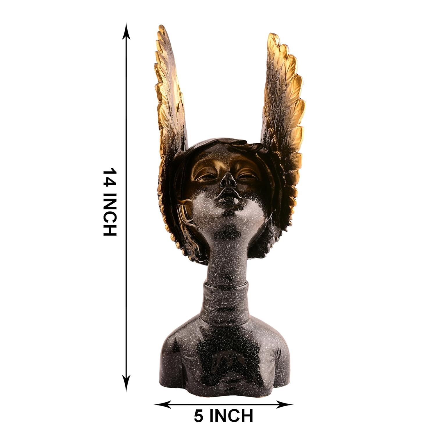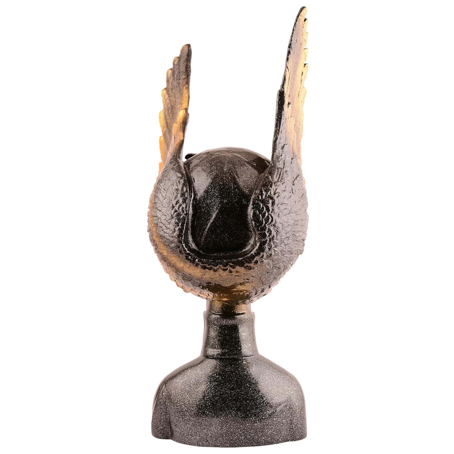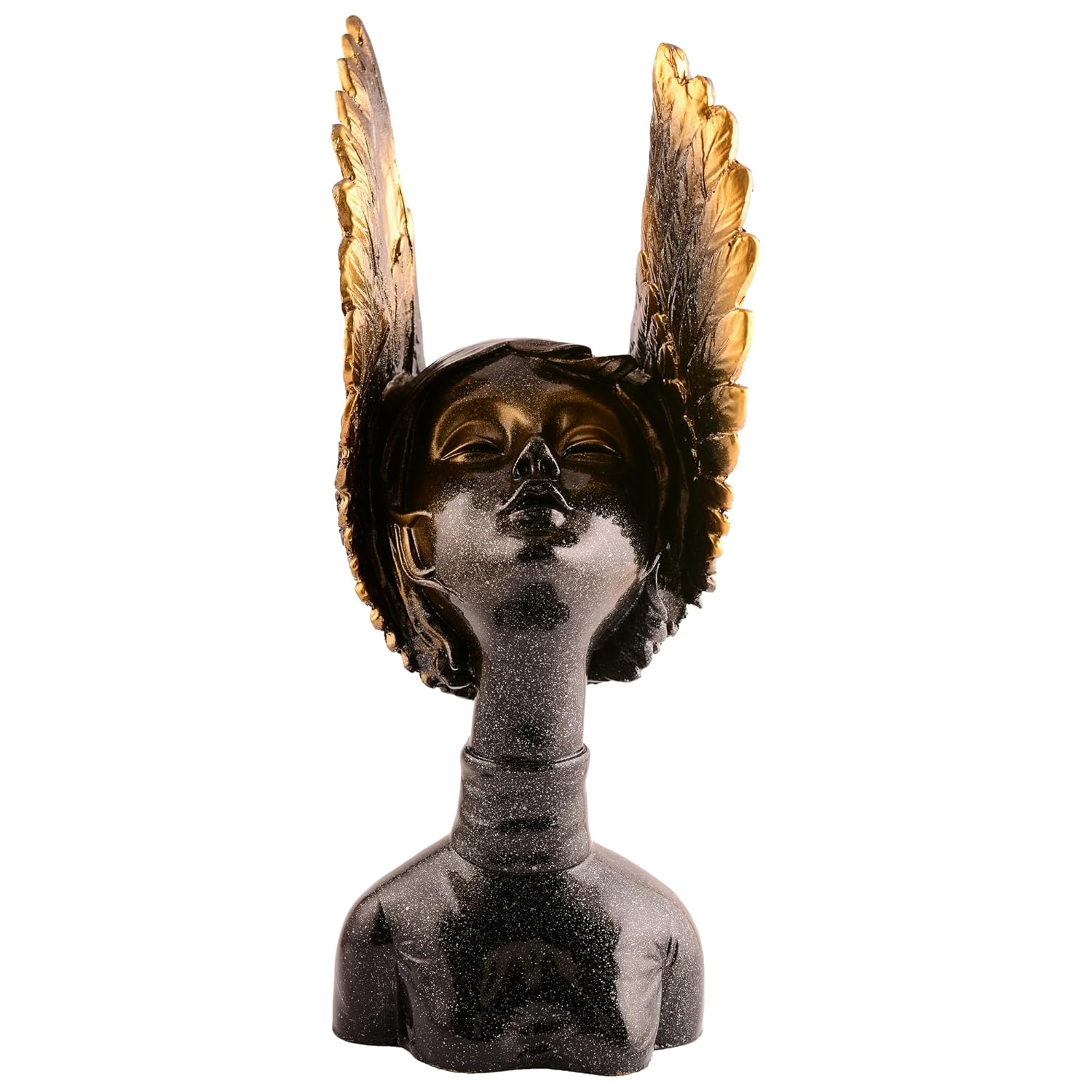- DESIGN ELEMENTS: Features a dramatic winged headdress with gold-tipped feathers contrasting beautifully against the black finish