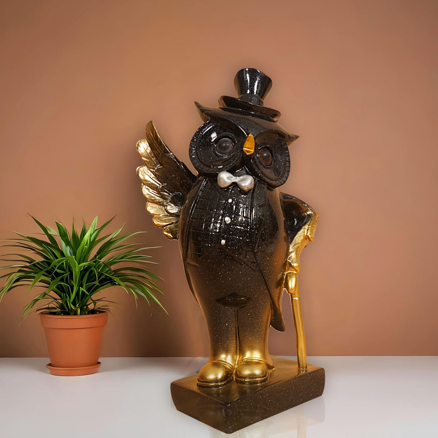 - Unique owl sculpture dressed like a gentleman with a hat, bow tie, and cane.